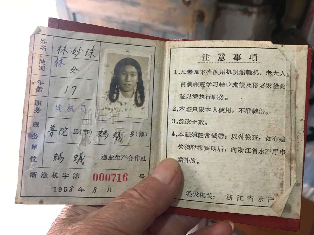 “那时候我16岁,普陀中学初中毕了业,当时家庭条件实在太困难了,我也不愿意再读书增加我阿爹的负担。有一天乡政府的领导来了我家,我就趁着这个机会,我自己向领导提出,要学习技术去捕捞船上工作。男人可以做的事,我们女人为什么不可以呢?我们蚂蚁岛妇女也能为国家为家庭做贡献。”就这样,阿婆和同时期另外三个妇女一起,经过学习与实践成为了普陀第一批女船员,并在“妇女号”上开始做起了“二轨”,轮机长的助手。