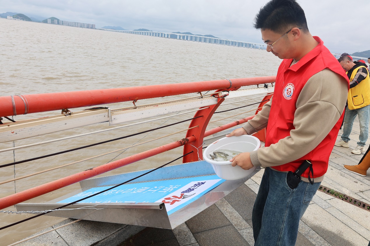 学院志愿者们认真参观“我在东海有条鱼”系列宣传海报板,深入学习了科学放鱼(放生)倡议、以科学放鱼为契机的东海生态共富探索、东海放鱼菜单等内容。中国渔业协会原生水生生物及水域生态专委会委员、中国水产学会科学放生专家团队专家、普陀科学放生护生联合会会长徐方成为志愿者们解读了科学放鱼的重要意义、放流规则以及辨别外来物种的方法。随后,志愿者们共同前往指定区域,进行舟山岱衢族大黄鱼、条石鲷、虎头鱼、鮸鱼、海蜇等5个品种总计25万尾鱼苗的放流,他们仔细检查鱼苗的健康状况,小心翼翼地将鱼苗放入海中,确保每一尾鱼苗都能顺利适应新的环境。
