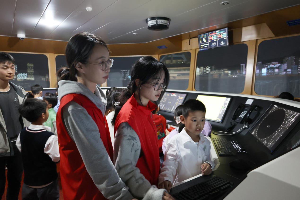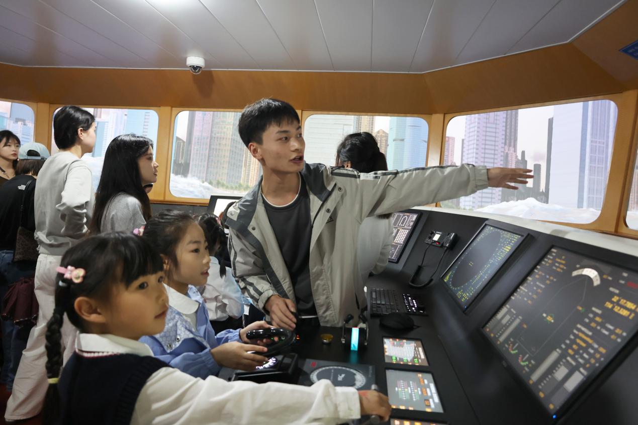 在学校大型船舶操纵模拟器实验室,浩瀚海洋尽展于屏幕之上,各类仪器层层揭开蔚蓝深处的奥秘。小朋友们在仪表屏前驻足,目光满含好奇与憧憬。在海大志愿者的帮助下,他们握紧操纵杆,如同置身真实的航海世界,化身为小小船长,在碧波上逐梦扬帆,在波澜壮阔的蓝色世界里体验驾驶的乐趣,感受着与大海共舞的激情与自由。