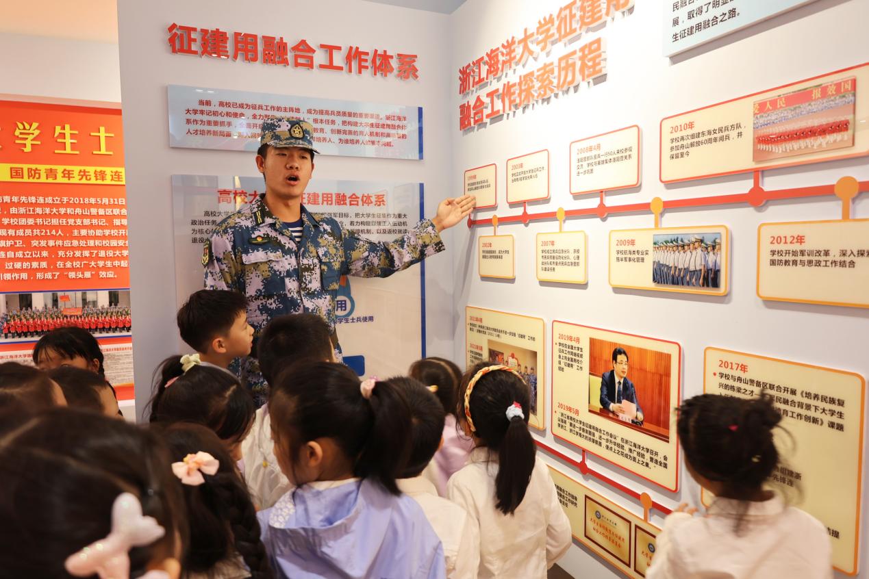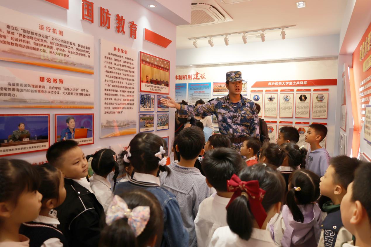 在学校征建用融合工作成果展示厅,市“红领巾巡讲团”成员、校国防青年先锋连副连长李子杰为小朋友们讲述了学校征建用融合工作的探索历程,介绍了学校“蓝色领航、国防铸魂”的思政育人理念和学校国防教育教学取得的成果、产生的效应和社会影响力,增强了小朋友们的爱国情怀和国防意识,激发了他们学习国防知识、传承红色基因的热情。