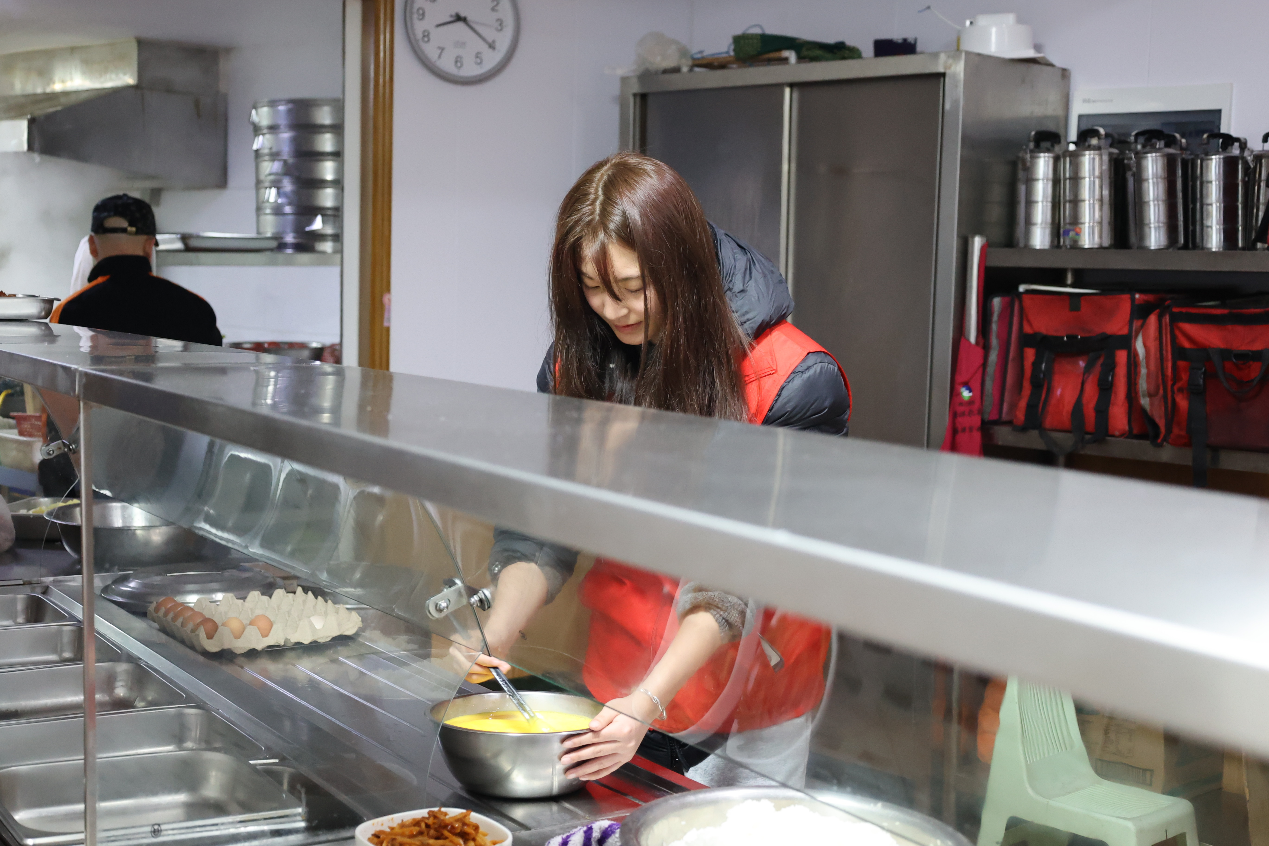 随着饭点临近,志愿者们再次投入到紧张的忙碌中。他们与食堂工作人员紧密配合,仔细擦拭盛放饭菜的台面,确保每一处都干净整洁。同时,志愿者们熟练地准备食材,搅拌蛋液,传递所需物品,动作流畅而有序。他们的细致与专注,为老人们营造了一个卫生、舒适的用餐环境。