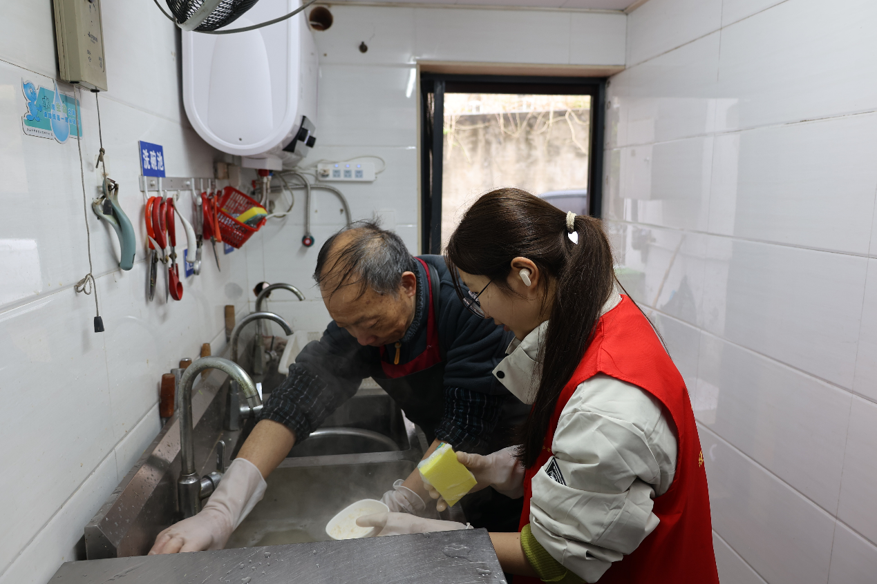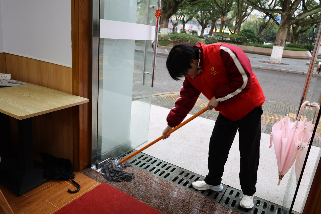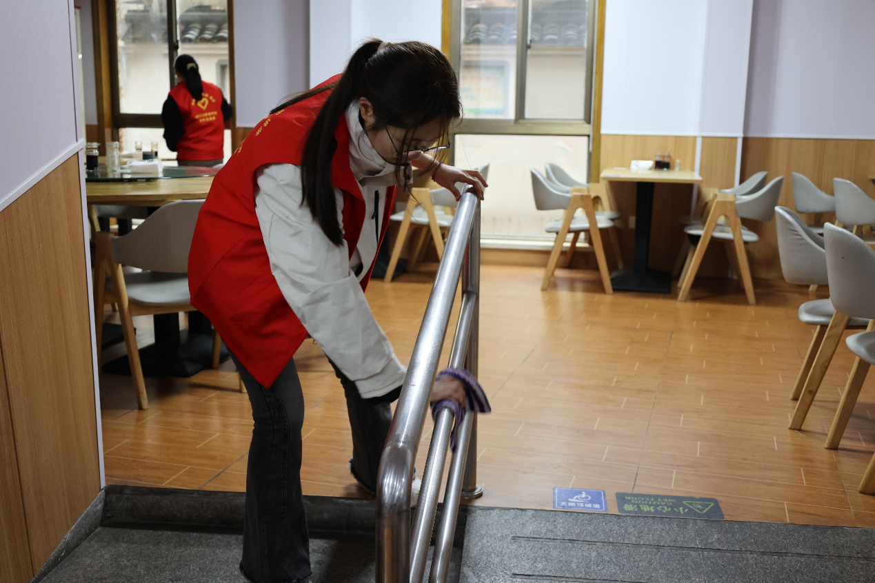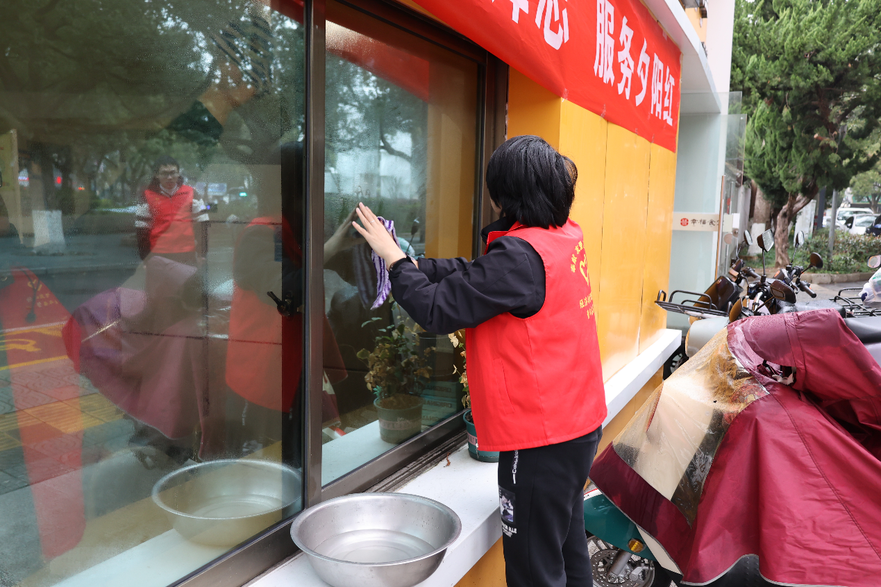 身着红色马甲的志愿者们热情洋溢,干劲十足。他们认真清扫食堂门外的道路,将落叶和杂物清理干净,为老人们营造整洁的外部环境。志愿者们还仔细擦拭食堂内外的窗户和桌椅,确保食堂更加窗明几净。他们还耐心擦拭连接用餐区与打饭区的扶手,确保老人在取餐和用餐过程中更加安全和舒适。这些细致入微的行动,无不展现了志愿者们对长者的关怀与尊重。
