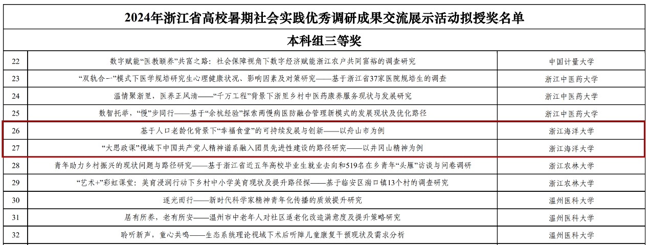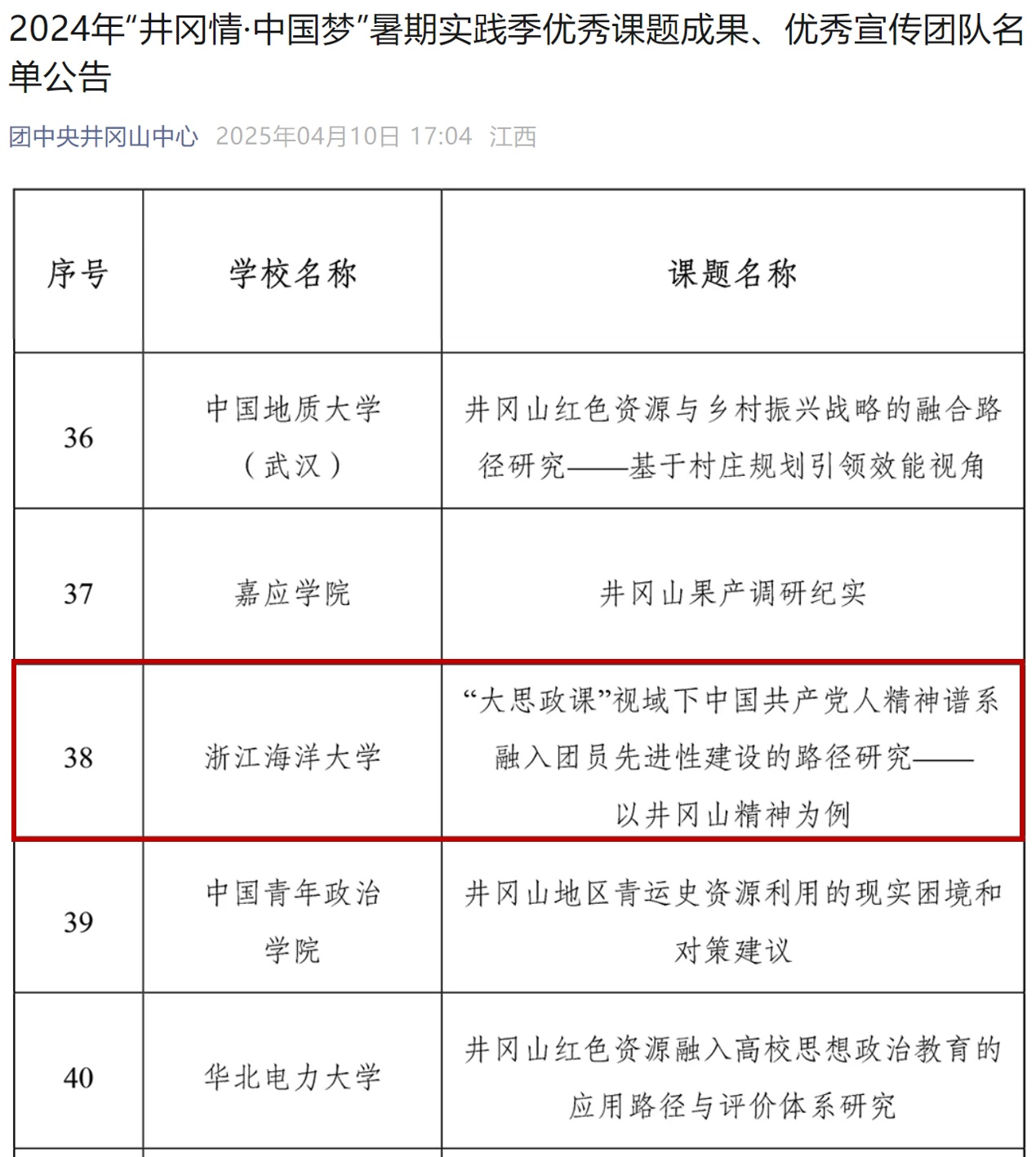 近日,由团中央青年发展部、全国青少年井冈山革命传统教育基地管理中心组织开展的2024年“井冈情·中国梦”全国大学生暑期社会实践专项行动优秀成果评选结果揭晓。williamhill官网登录入口“山海相约,‘冈’好‘屿’见”实践团的课题《“大思政课”视域下中国共产党人精神谱系融入团员先进性建设的路径研究——以井冈山精神为例》获评“优秀课题成果”,全国仅75件作品获此荣誉,浙江省高校唯一一项,也是学校连续第二年获评。
