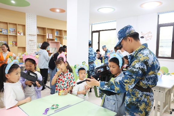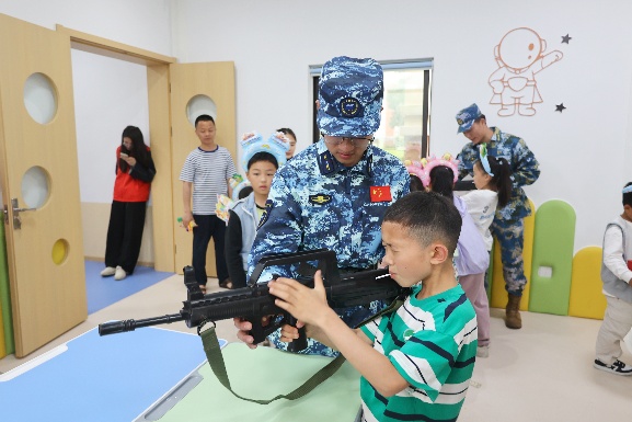 国防青年先锋连的退役大学生们还为孩子们现场演示了标准持枪姿势和动作要领。孩子们兴致勃勃、分组上阵,亲手触摸了95式自动步枪模型。在大学生们手把手的指导下,还认真学习了握枪、瞄准、站姿等基础动作,小小的脸庞写满认真与兴奋,眼中闪烁着对军营世界的无限向往。在这一刻,军人的形象在他们心中愈发高大,一颗颗热爱国防的种子悄然发芽。