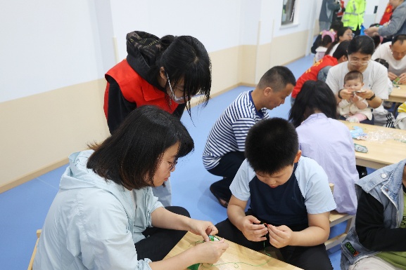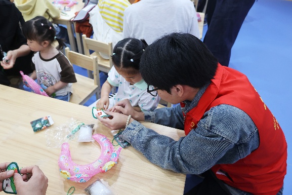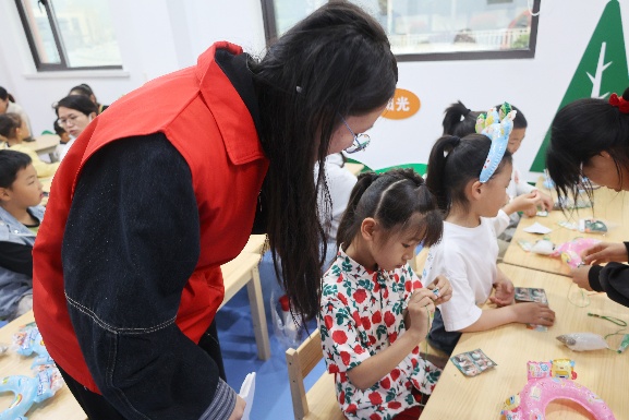 活动伊始,孩子们欢声笑语地围坐在桌前,桌上铺满了五彩丝线、清香艾草和绣花布料。海大志愿者们化身“巧手老师”,一边讲述端午节的故事,一边为孩子们耐心指导。不一会儿,孩子们的小手灵巧地在布料间穿梭:穿针引线、填入香料、细心打结……一只只香气扑鼻、形状各异的小香囊悄然成型。他们举着作品眉眼弯弯,仿佛捧着一份专属的节日喜悦,在指尖中触摸传统的温度。