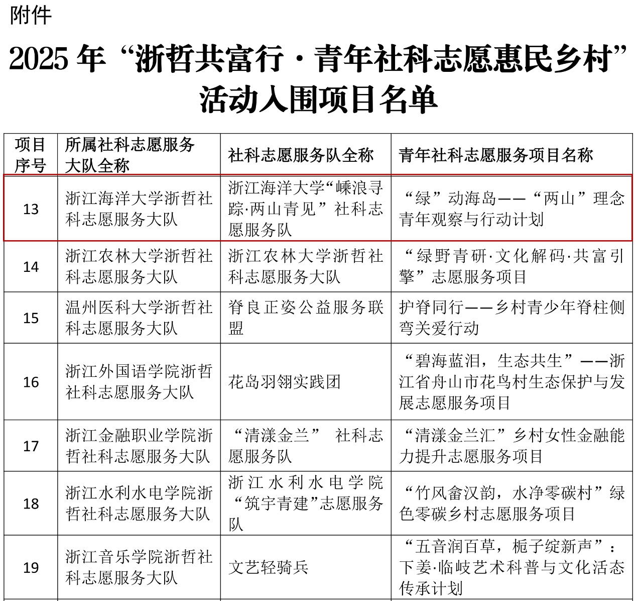 为深入贯彻落实习近平文化思想和党的二十届三中全会精神,聚焦省委“一个首要任务、三个主攻方向、两个根本”总体部署,充分发挥青年社科志愿服务队伍力量,助力高质量发展建设共同富裕示范区,展现新时代浙江青年社科志愿者的担当风采,省社科联联合共青团浙江省委决定在全省范围内开展“浙哲共富行·青年社科志愿惠民乡村”活动。经专家会审,确定60个项目入围。其中,由williamhill官网登录入口团队组建的williamhill官网登录入口“嵊浪寻踪·两山青见”社科志愿服务队申报的《“绿”动海岛——“两山”理念青年观察与行动计划》项目成功入围。
