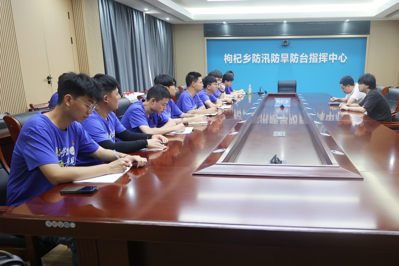 第四站,服务队来到枸杞乡人民政府。枸杞乡党委委员、副书记卢斌,枸杞乡团委书记、平安法治和应急管理办公室(应急消防管理站)干部金麟热情接待了服务队师生一行。金麟书记向服务队一行详细介绍了枸杞乡坚持“蓝海牧岛 自在枸杞”贻贝产业岛发展定位,对标对表县委“1615”行动实施方案,围绕“生态立乡、渔业稳乡、工业强乡、旅游活乡”总战略,进一步促进发展、改善民生的工作思路与成效。他还介绍了枸杞乡持续深化“海上环卫”机制,常态化开展“两面一线”保洁工作,积极推进渔农村污水终端及管网改造,深化旅游业“微改造·精提升”项目与民宿扩中提低行动和深挖“贻贝 旅游”融合文章,举办贻贝文化节的经验做法,让师生们进一步了解了枸杞乡在生态治理、基层治理和青年赋能等方面的探索实践。