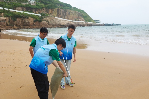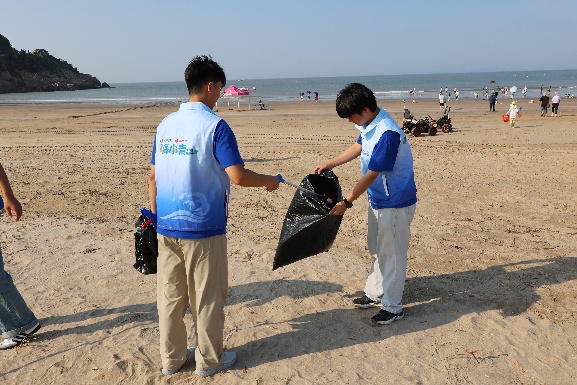 志愿服务队成员化身为“生态卫士”“海洋保卫者”,他们手持夹钳与环保袋,或半蹲、或俯身,细致地夹起食品袋、塑料瓶、纸屑、枯萎海草、烟蒂等垃圾。同学们热情不减,脚踏实地,专注投入的身影,成为这片海滩上最耀眼的风景。志愿者们还认真完成垃圾分类称重、转运处理等后续任务。经过清理的沙滩,再次展现出它纯净自然的美丽,仿佛在告诉大家,每一份微小的付出都可以凝聚成保护海洋的巨大力量。经过全体志愿者的共同努力,护海净滩行动共拾取硬塑料、膜状塑料、玻璃陶瓷类、金属类等各类垃圾共380.5千克。这些数字不仅展现了净滩行动的实际成果,更象征着志愿者们对保护海洋环境的承诺与担当。