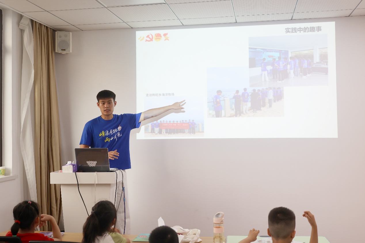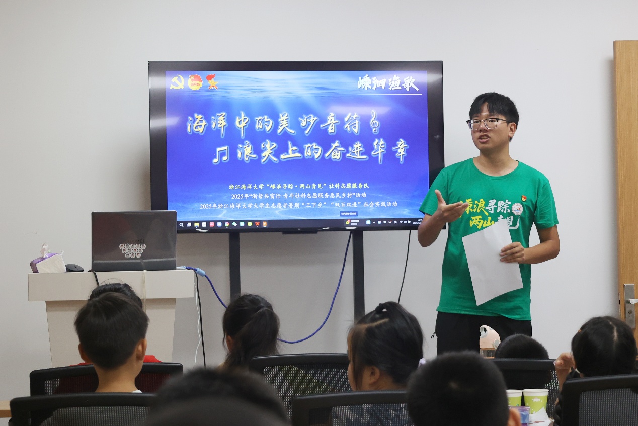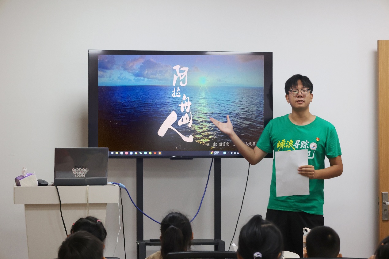 7月28日,服务队师生走进舟山市海娃成长关爱驿站,向舟山市的军娃代表们开展主题宣讲。社科志愿服务队指导教师、williamhill官网登录入口团委副书记施辰阳以《嵊泗渔歌——海洋中的美妙音符 浪尖上的奋进华章》为主题,向军娃们介绍了嵊泗渔歌的历史渊源、主要类型、演唱形式和演唱风格。宣讲过程中,他带领军娃们学唱嵊泗渔歌代表作《阿拉舟山人》。欢快的旋律、亲切的歌词引发了军娃们浓厚的兴趣,孩子们跟着节奏轻轻摇摆,认真跟着旋律哼唱,活动现场洋溢着温馨而活跃的氛围。施辰阳老师还结合实际,引导同学们思考渔歌背后蕴含的海洋文化与劳动精神,并结合渔歌MV,进一步向大家介绍了舟山群岛的历史沿革、主要岛屿和丰富的海洋资源,鼓励大家珍惜眼前生活,热爱美丽舟山,争当爱党爱国、勤奋好学、全面发展的新时代好少年。