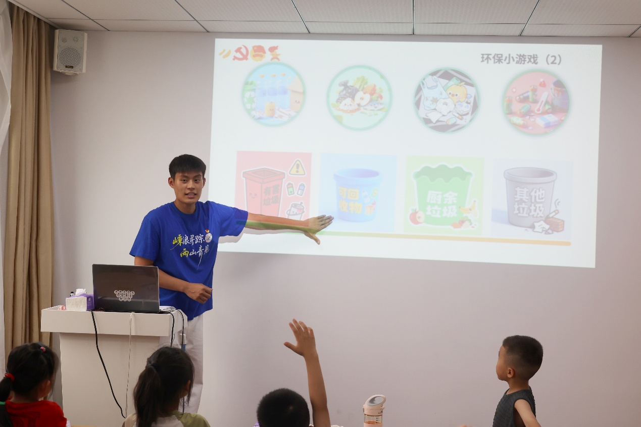 服务队学生田一洋以《嵊浪寻踪 两山青见》为主题,向在场的军娃们分享了他在嵊泗参加暑期社会实践时的所见所感。他向军娃们详细讲述了他参观嵊泗抗战纪念馆过程中感受到的革命精神、在海上牧场近距离观察渔业生态时的震撼体验,以及学习“航行的支部”经验时对基层治理理念的深刻理解。同时,他还分享了自己学唱嵊泗渔歌、参与“海小青”护海净滩志愿公益行动、向游客和居民宣传垃圾分类理念的体会,号召大家共同守护蓝色家园。为了让军娃们更好地理解“两山”理念,田一洋还带领大家开展了一场垃圾分类挑战游戏,小朋友们积极举手抢答,踊跃参与,田一洋还为他们送上了精美小礼物作为鼓励。最后,他真诚地呼吁军娃们从小树立环保意识,从身边小事做起,用自己的实际行动守护绿水青山。