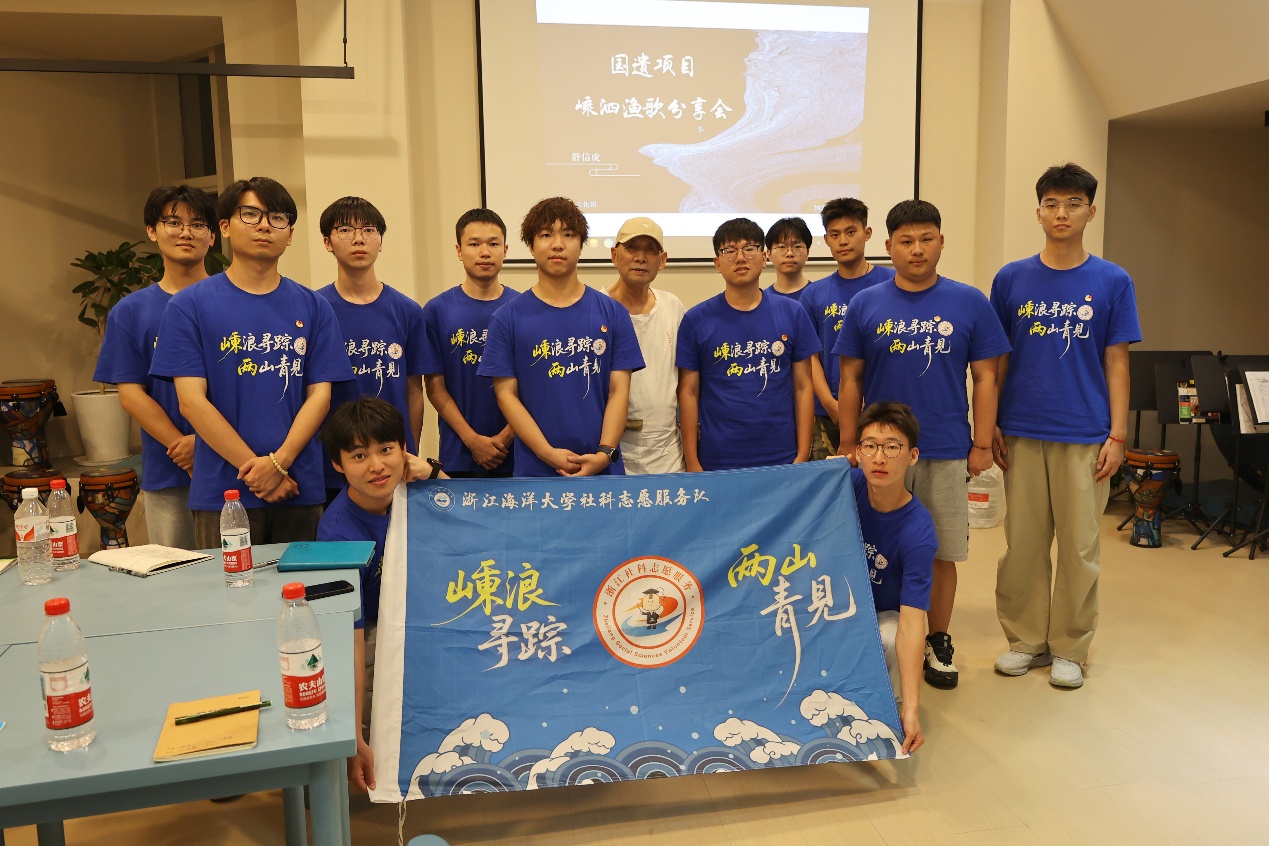 服务队成员还在舒信虎老师的带领下亲身体验渔歌的节奏与演唱方式,感受到原生态艺术的独特魅力。舒信虎老师还介绍了自己近年来整理、修复、改编、创作的渔歌成果,介绍了“舒信虎工作室”“渔歌号子馆”的建设和传承理念,鼓励青年学子共同参与到嵊泗渔歌的守护与传播中。