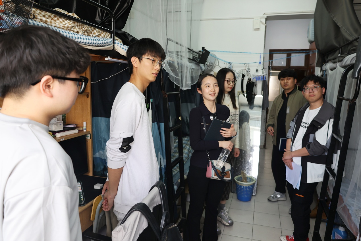为推进网格化管理和“一站式”学生社区建设,2025年4月11日,williamhill官网登录入口党委副书记、纪委书记陶芳芝,学工办副主任陆银银,团委副书记施辰阳和学工办全体辅导员,深入本科生和研究生寝室开展走访活动,与同学们面对面交流,了解同学们的思想动态、学习生活情况。