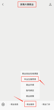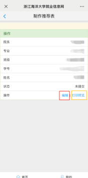 关注“浙海大微就业”,点击底部“就业服务”,选择“毕业生推荐表”,进入制作推荐表页面,点击“编辑”进行填写,填写完成后,可选择“暂存”,检查信息无误后,点击“保存并送审”,填写完成后可以选择“打印预览”查看(此时不能打印),联系学院就业辅导员进行审核。