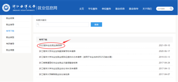打开williamhill官网登录入口就业信息网页面(网址:https://jy.zjou.edu.cn/),点击“常用下载”,选择“2022届毕业生就业推荐表”下载填写。由学院审核盖章后,交由学校就业指导中心审核盖章。