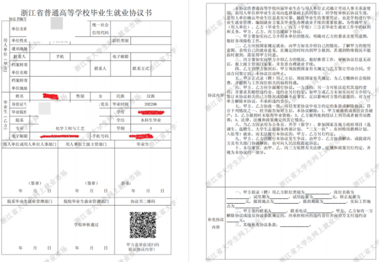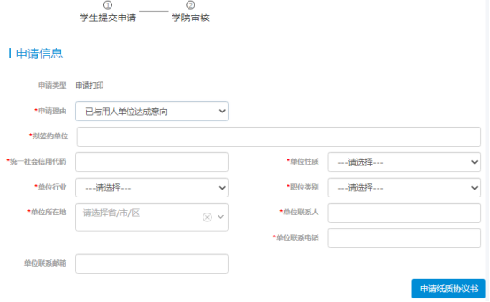 个人提交申请后,学院进行审核。审核通过后,选择“下载纸质协议书”,保存到本地并打印(协议书共2页,建议正、反面打印,打印3份)。打印后在毕业生签名处签字,交单位人力资源部盖章。
