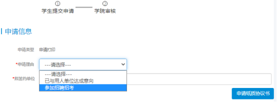 左侧功能栏,选择“申请纸质协议书”。申请理由,有两个选项:一是“已与用人单位达成意向”,二是“参加招聘招考”。如报考公务员、事业单位需出示就业协议书报名的同学,请选第二项。