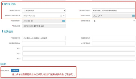 报到证签往单位,填写用人单位上级主管部门盖章的单位名称,或就业接收函盖章单位名称。报到证签往单位所在地,按照报到证签往单位的地址(省、市、区/县)选择。