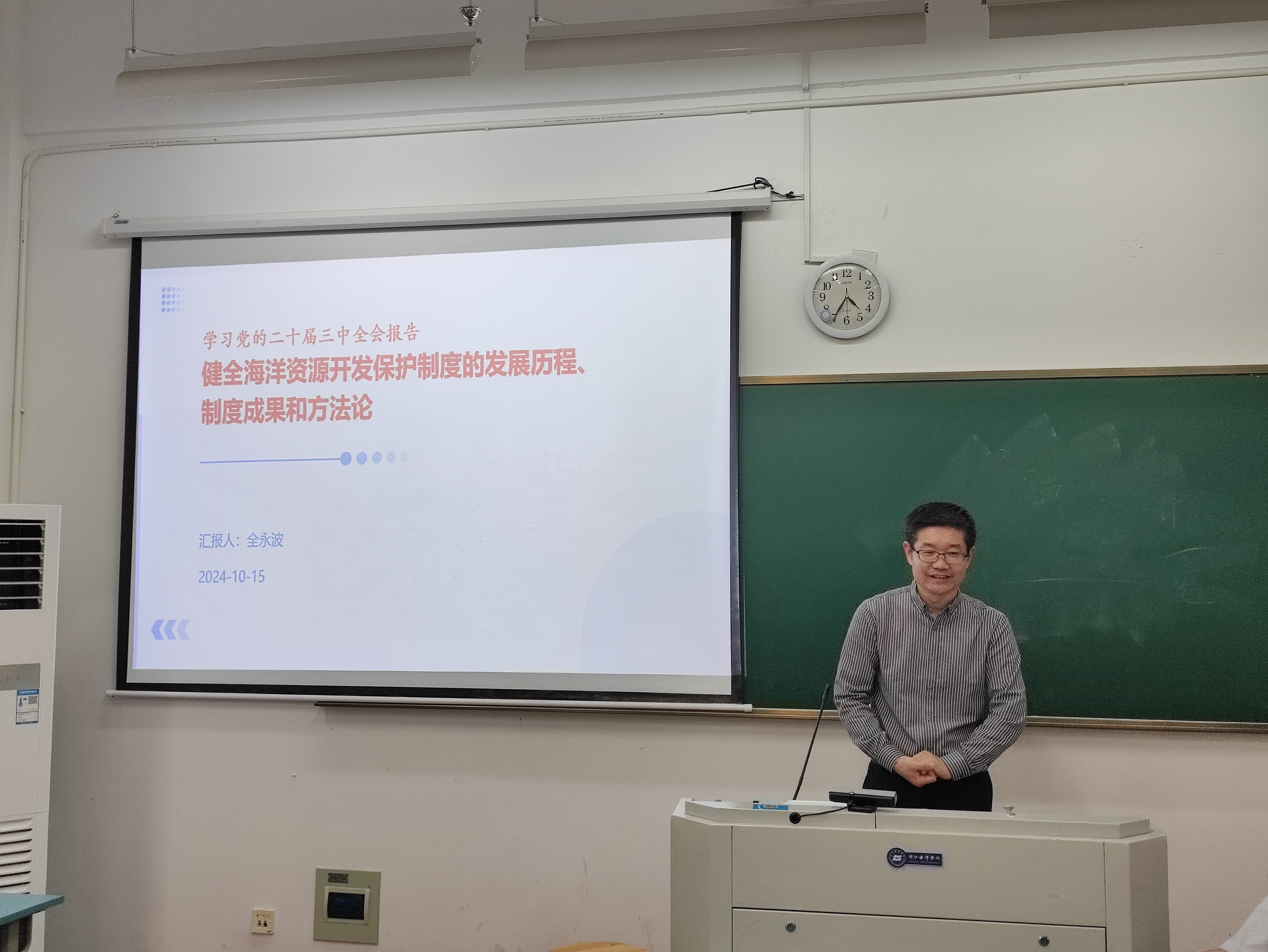 10月15日,在教学楼312教室,全永波院长为教师代表带来了一场深入浅出的讲座。本次讲座紧扣时代脉搏,结合刚刚闭幕的二十届三中全会精神,详细探讨了“健全海洋资源开发保护制度的发展历程、制度成果和方向展望”。