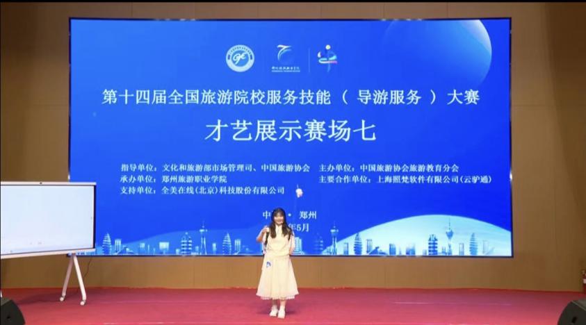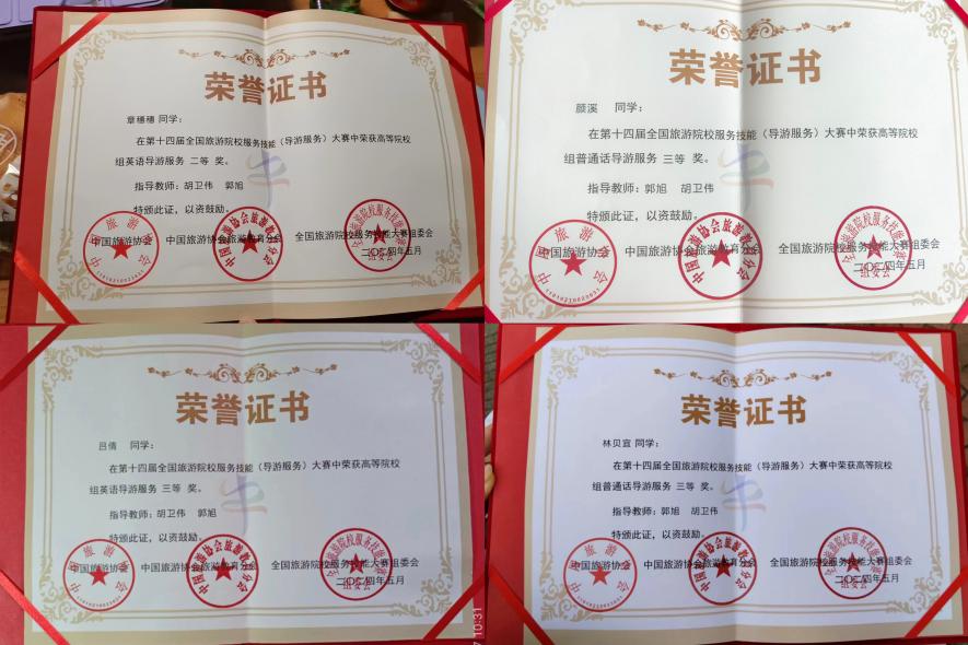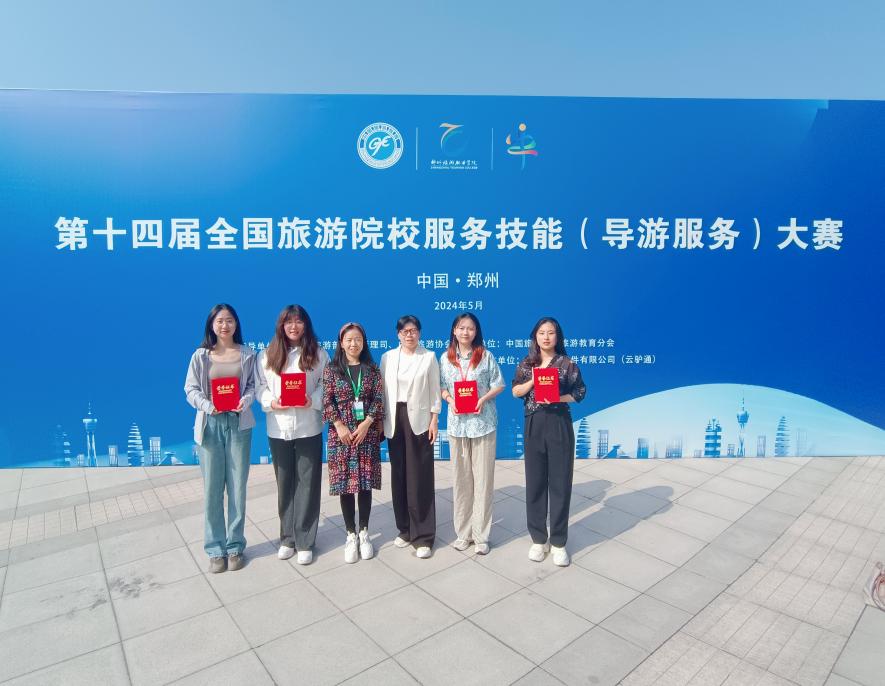 为深入学习贯彻党的二十大精神,落实习近平总书记关于旅游发展和高等教育的重要指示,助推旅游业成为新兴的战略性支柱产业和具有显著时代特征的民生产业、幸福产业,促进旅游高等教育高质量发展,2024年5月23日至5月26日,第十四届全国旅游院校服务技能(导游服务)大赛在郑州举行。由williamhill官网登录入口旅游管理系胡卫伟、张敏红、刘丹丹、卫玉倩老师带队,中文组2名同学和英文组2名同学参赛。历经三天激烈的比赛,A21旅游2章穗穗获高等院校组英语导游服务二等奖、A22旅游2吕倩获高等院校组英语导游服务三等奖、G21旅游颜溪和G22旅游林贝宜获高等院校组普通话导游服务三等奖。