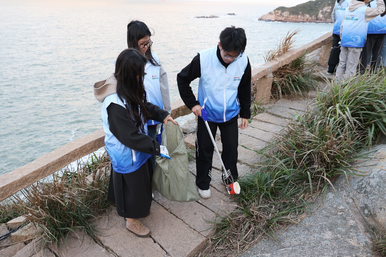 “海小青”志愿者们手持夹钳与环保袋,或半蹲、或俯身,细致地夹起食品袋、塑料瓶、纸屑、烟蒂等垃圾,同时向游客和当地居民宣讲垃圾分类、护海净滩等环保知识,倡导海洋生态保护意识,共同守护东福山岛的美丽自然环境。