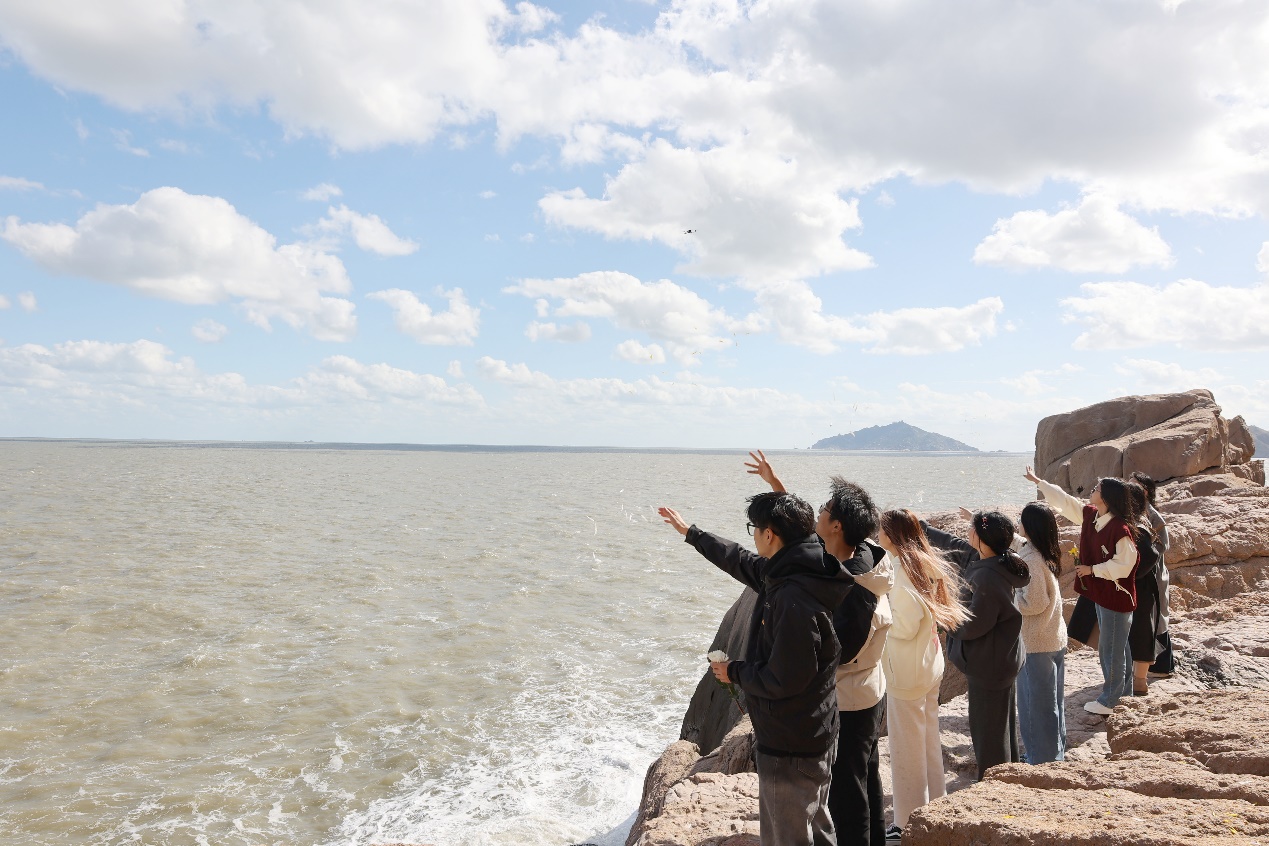 为了进一步挖掘“里斯本丸”救援精神的价值意蕴,师生们来到青浜岛“里斯本丸”沉船遗址(小孩洞),深入感悟当地渔民在危急时刻彰显的舍己救人、大爱无疆的精神品质。在沉船遗址,带队教师施辰阳、党员代表胡佳秀、团员代表王梓俊,分别分享了《里斯本丸沉没》的观影心得。学院学生会执行主席李明彦诵读了国家主席习近平复信“里斯本丸”号船幸存者家属精神。随后,全体师生集体默哀并面向大海撒上花瓣。